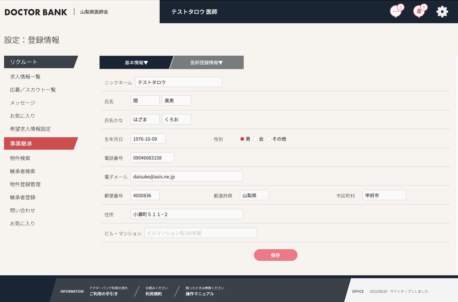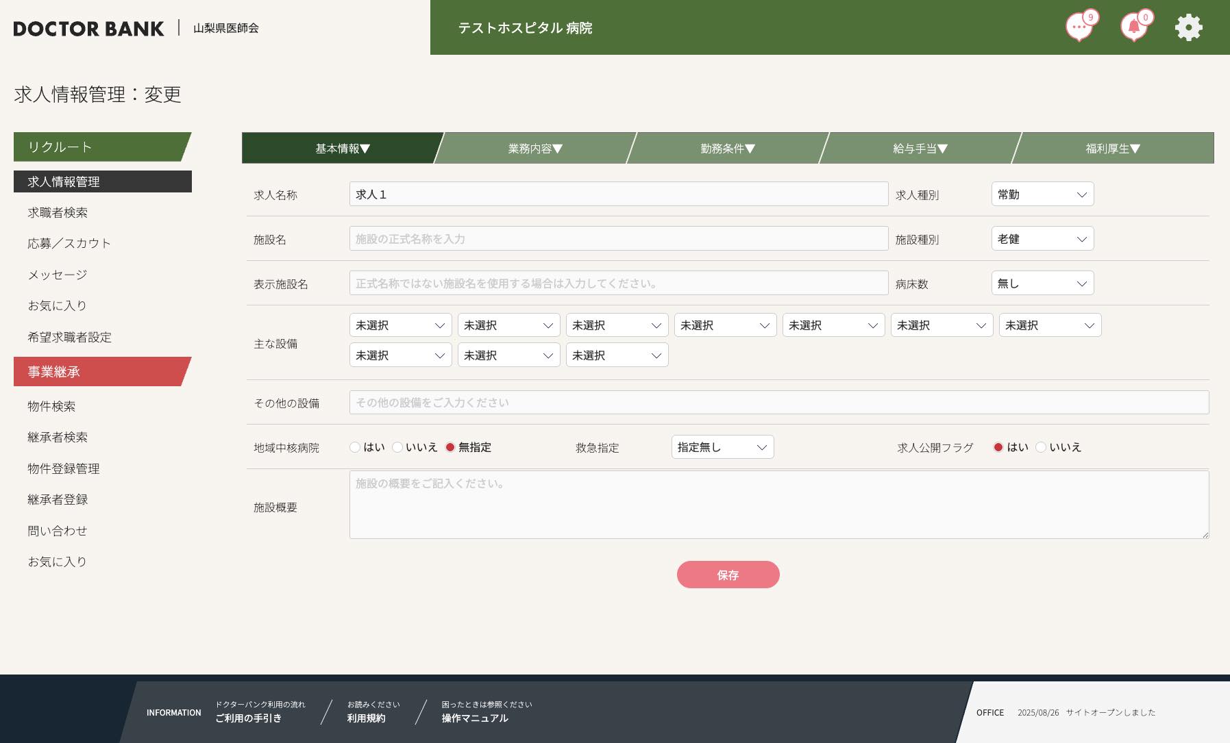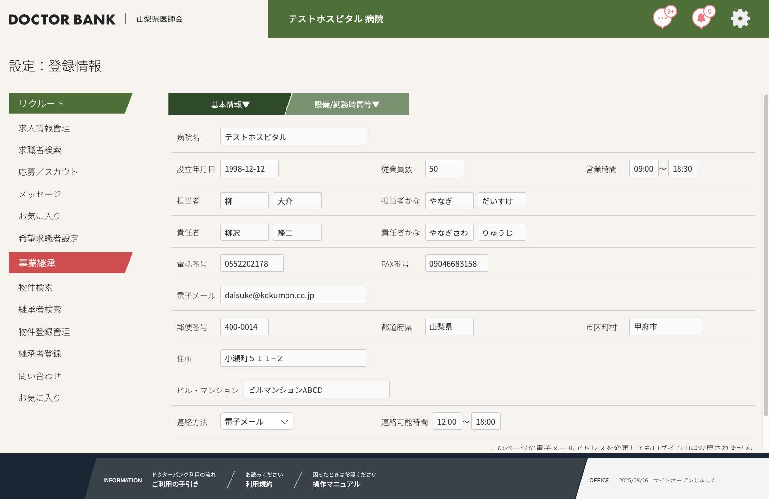 病院:病院名、設立年月日などの企業情報を入力します。入力された情報は病院の基本情報として表示されます。