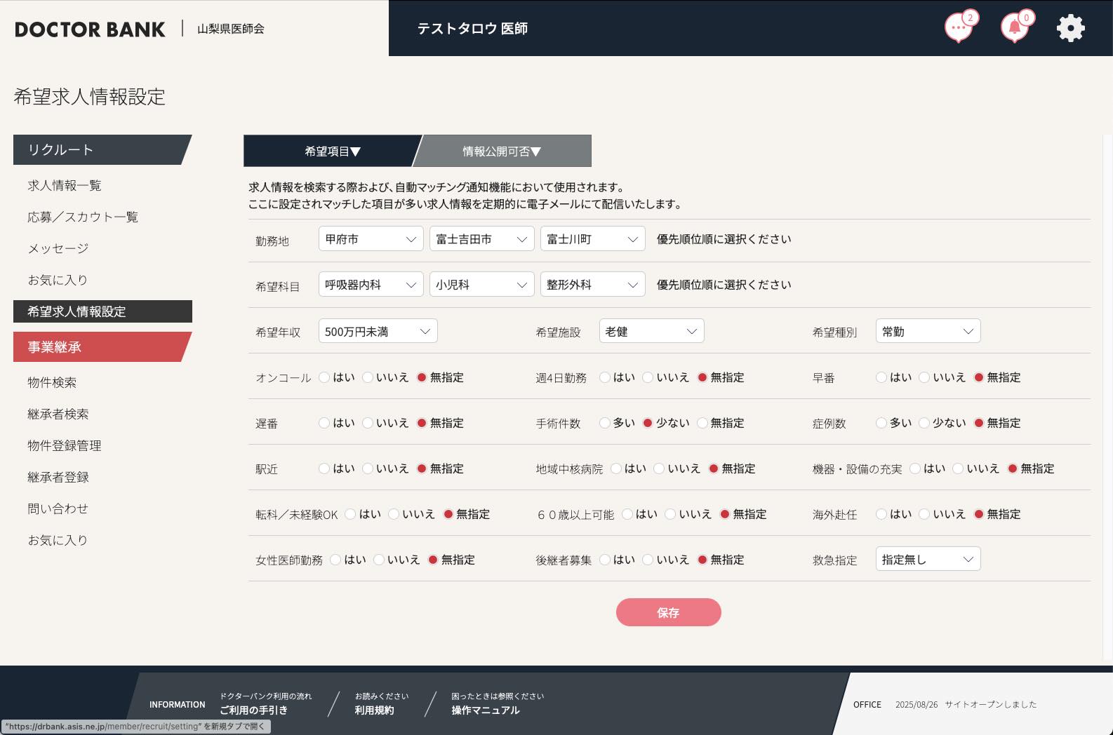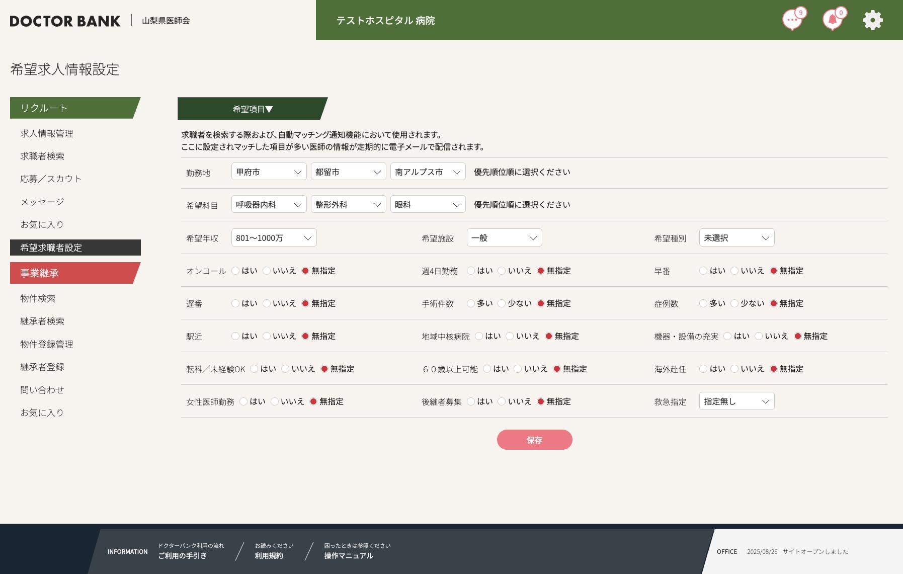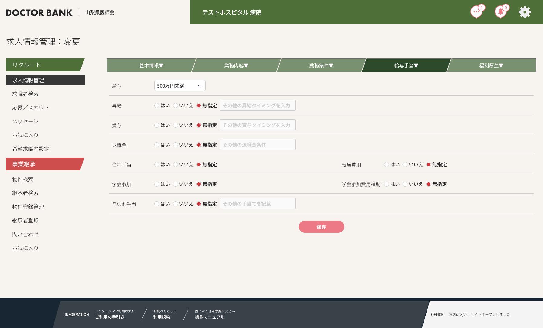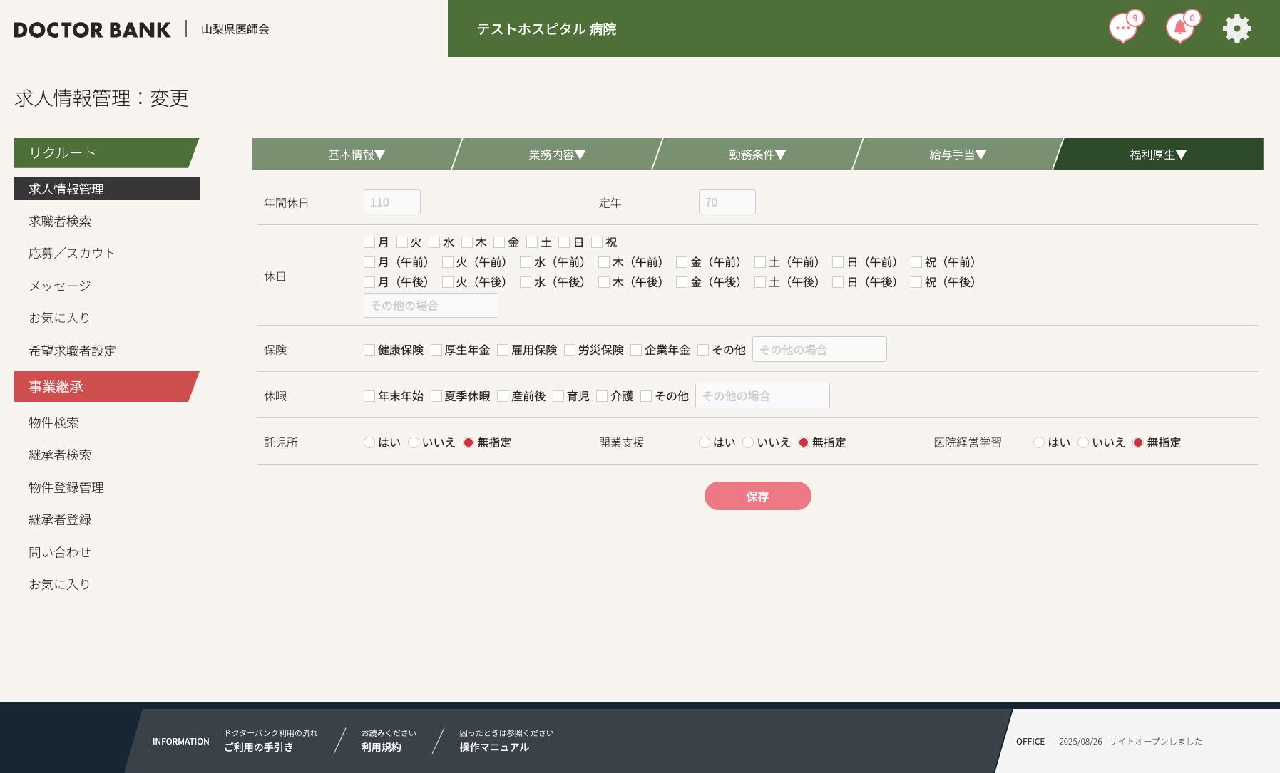 病院:病院名、設立年月日などの企業情報を入力します。入力された情報は病院の基本情報として表示されます。