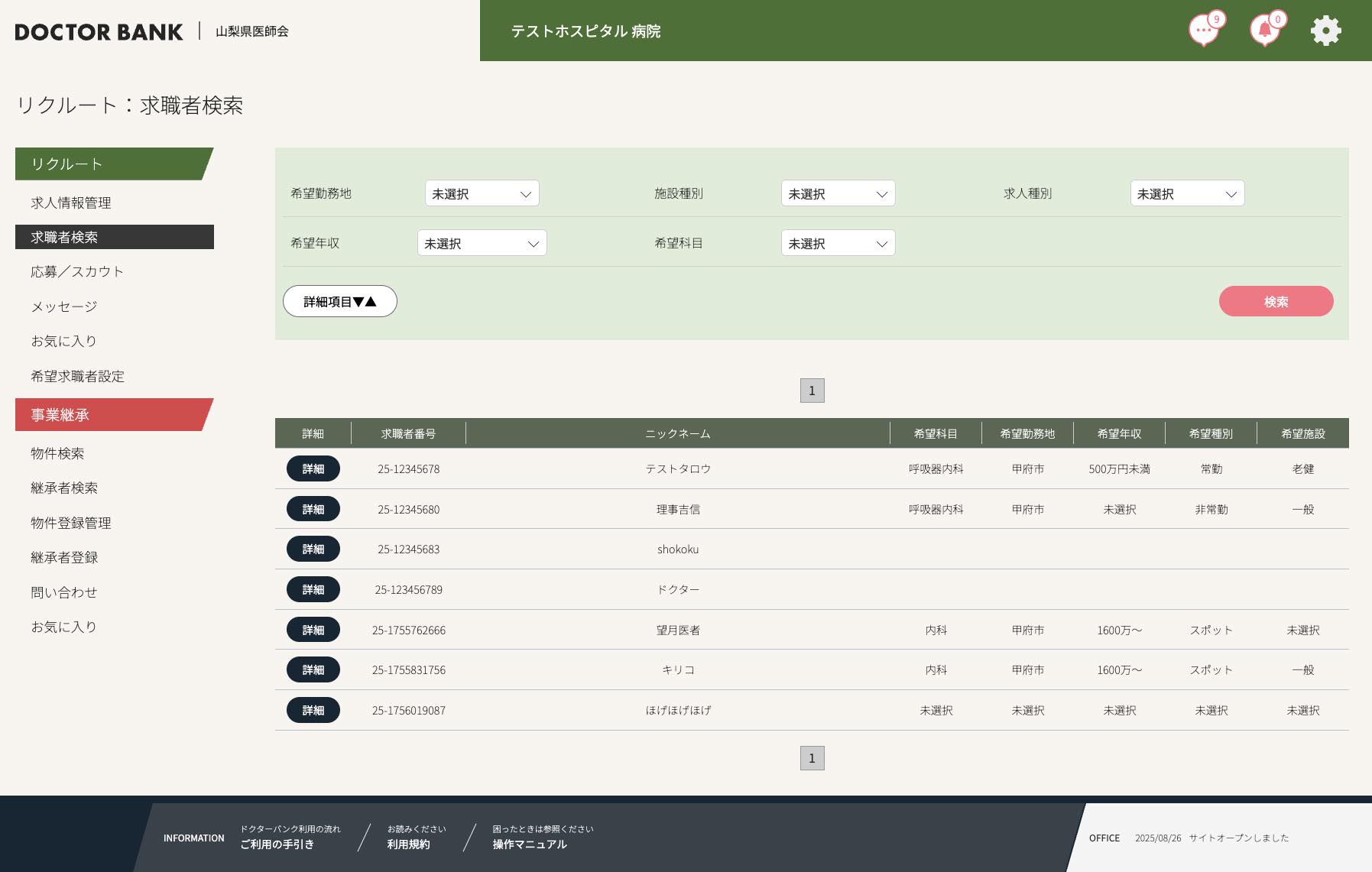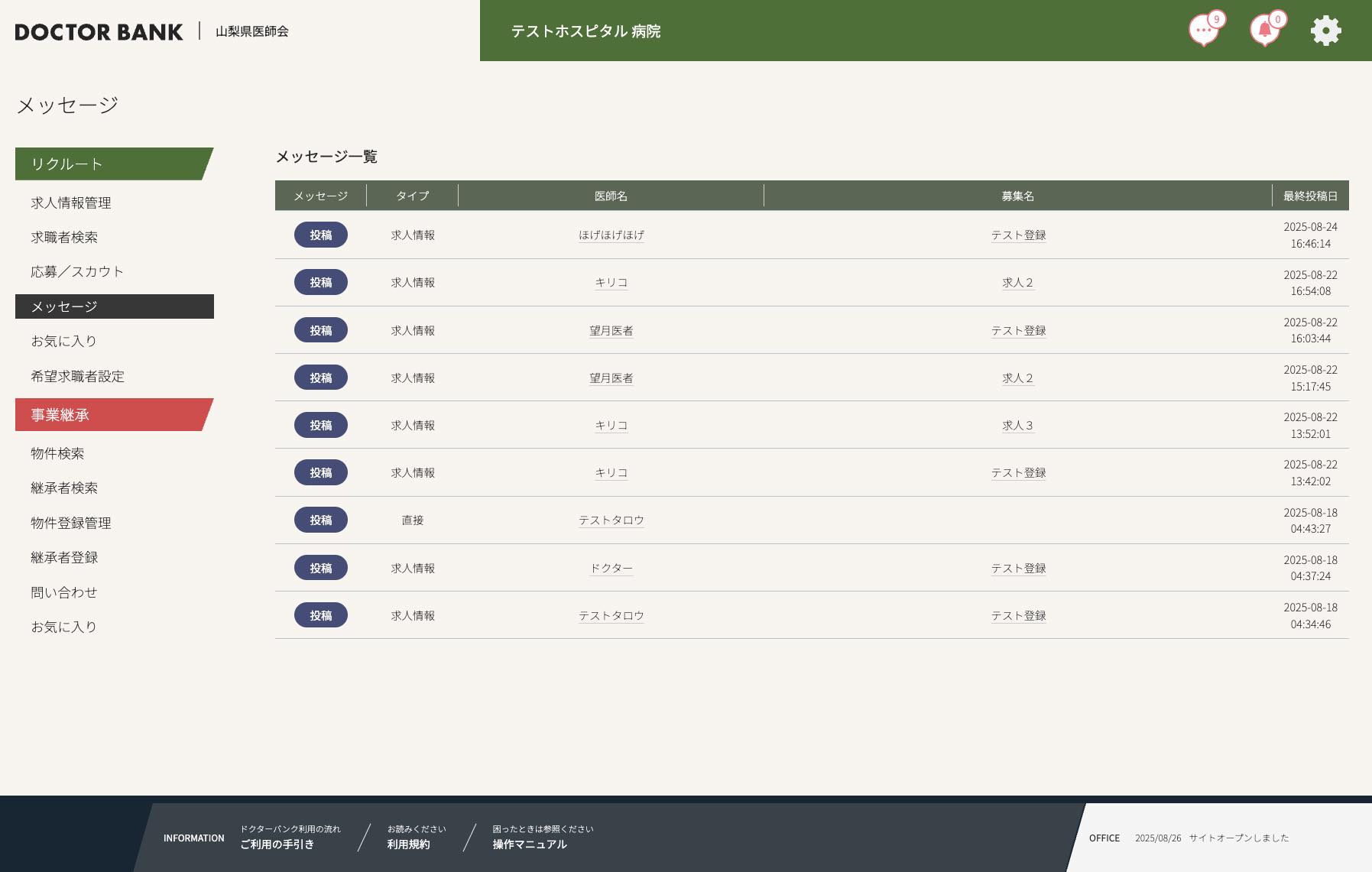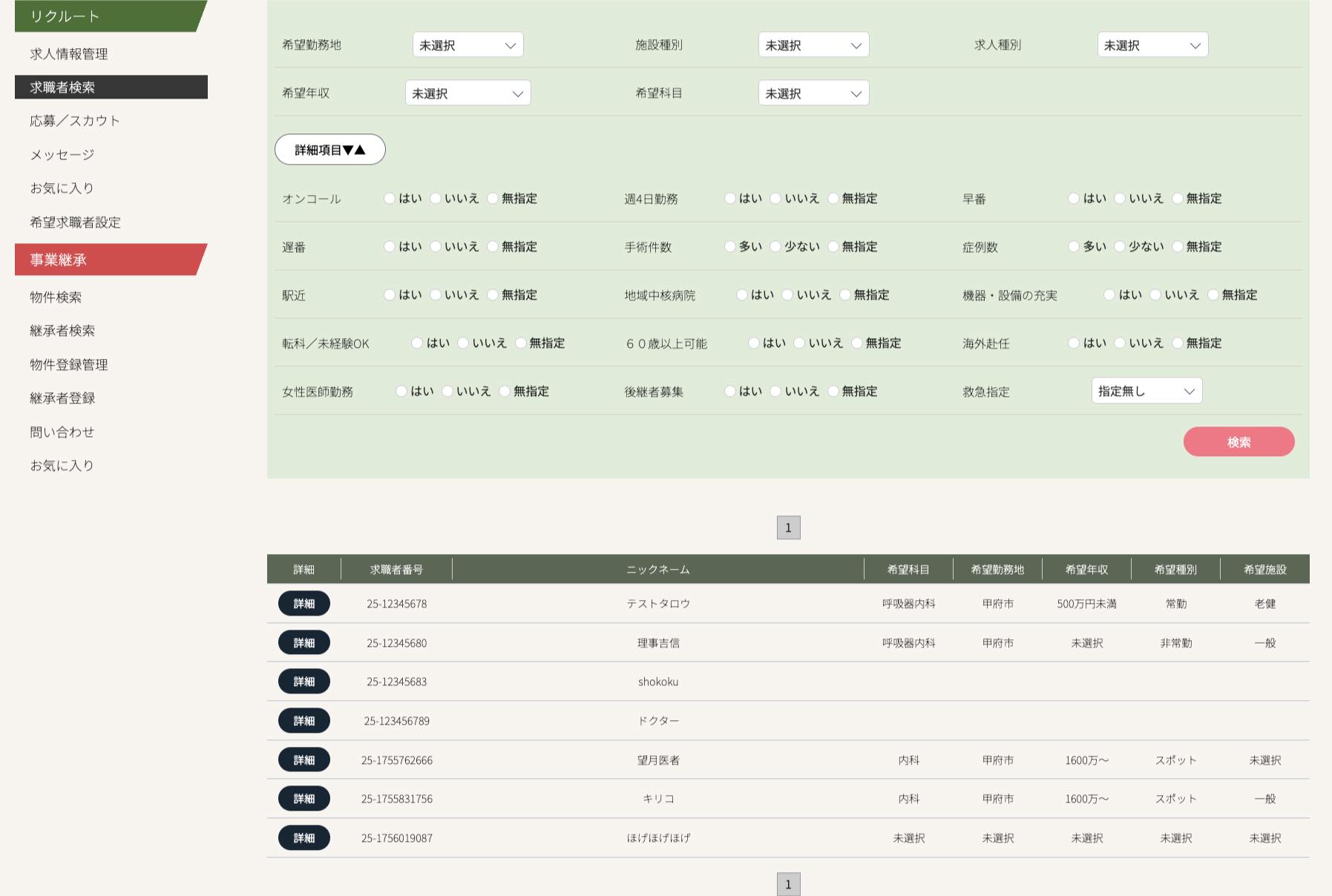 応募:応募は医師から貴病院の求人情報に対して行われます。応募された内容は一覧に表示され、応募者名をクリックすることで応募者の情報を閲覧することができます。