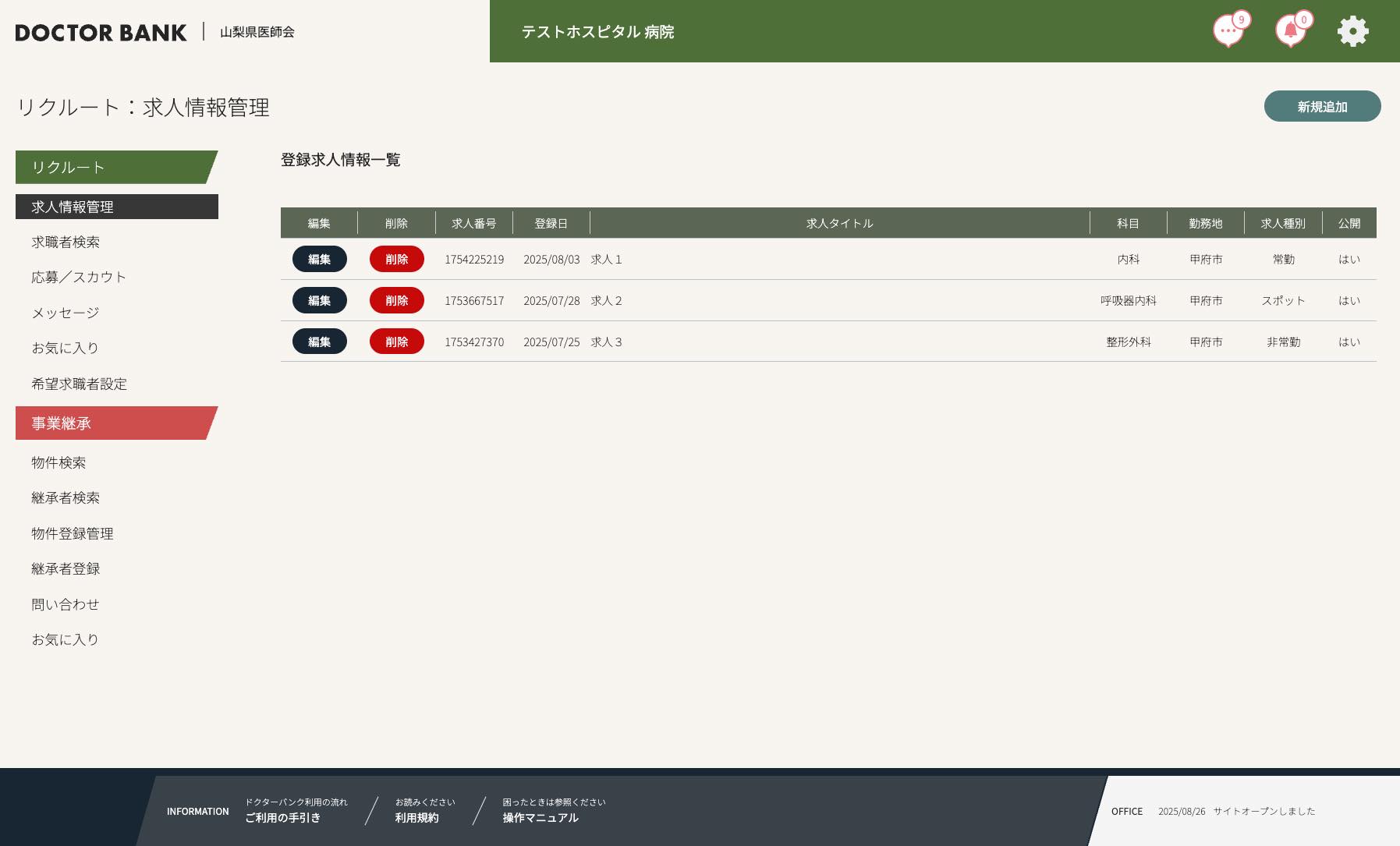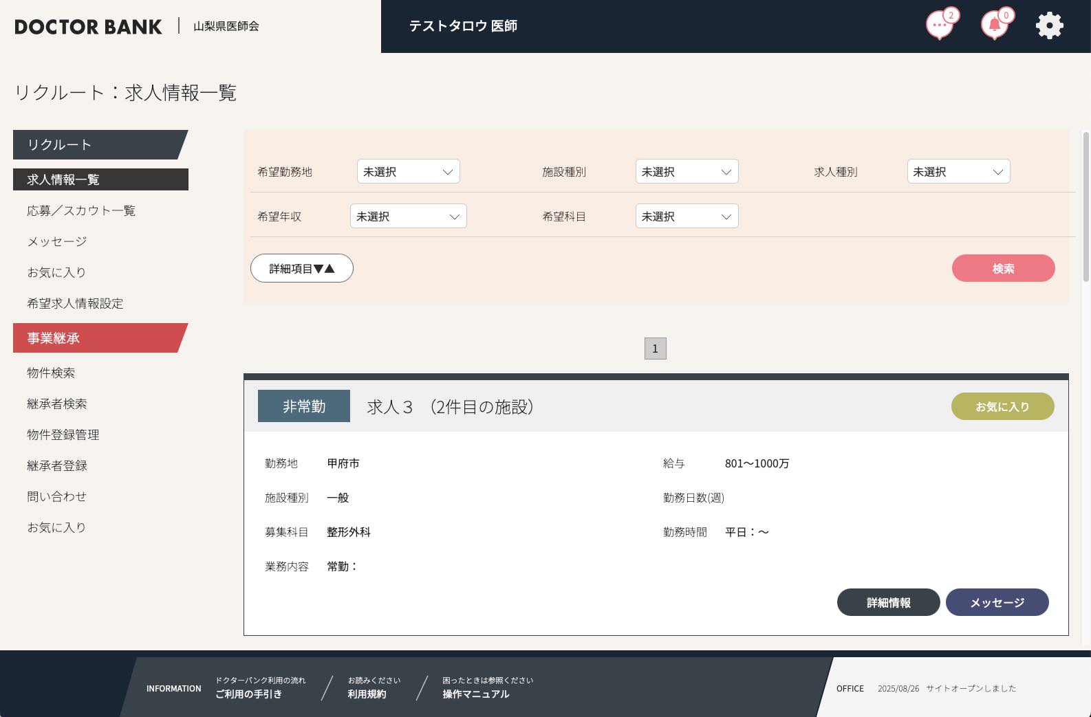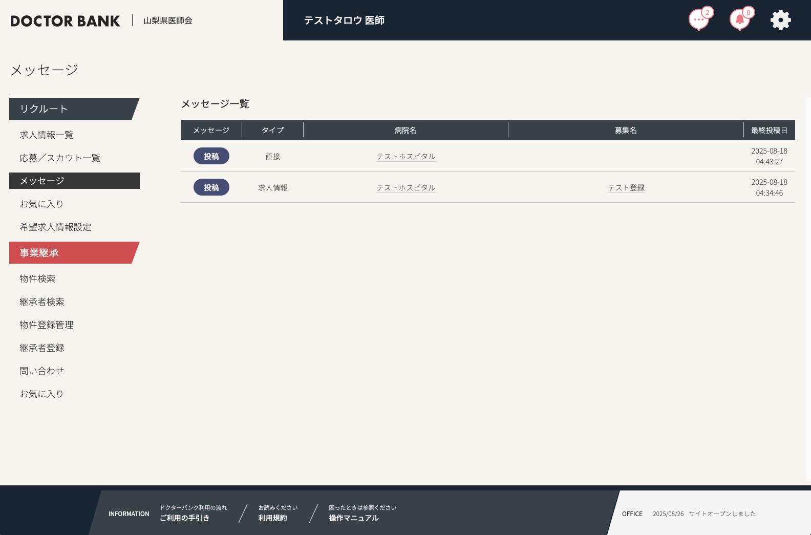 応募:応募は医師から貴病院の求人情報に対して行われます。応募された内容は一覧に表示され、応募者名をクリックすることで応募者の情報を閲覧することができます。