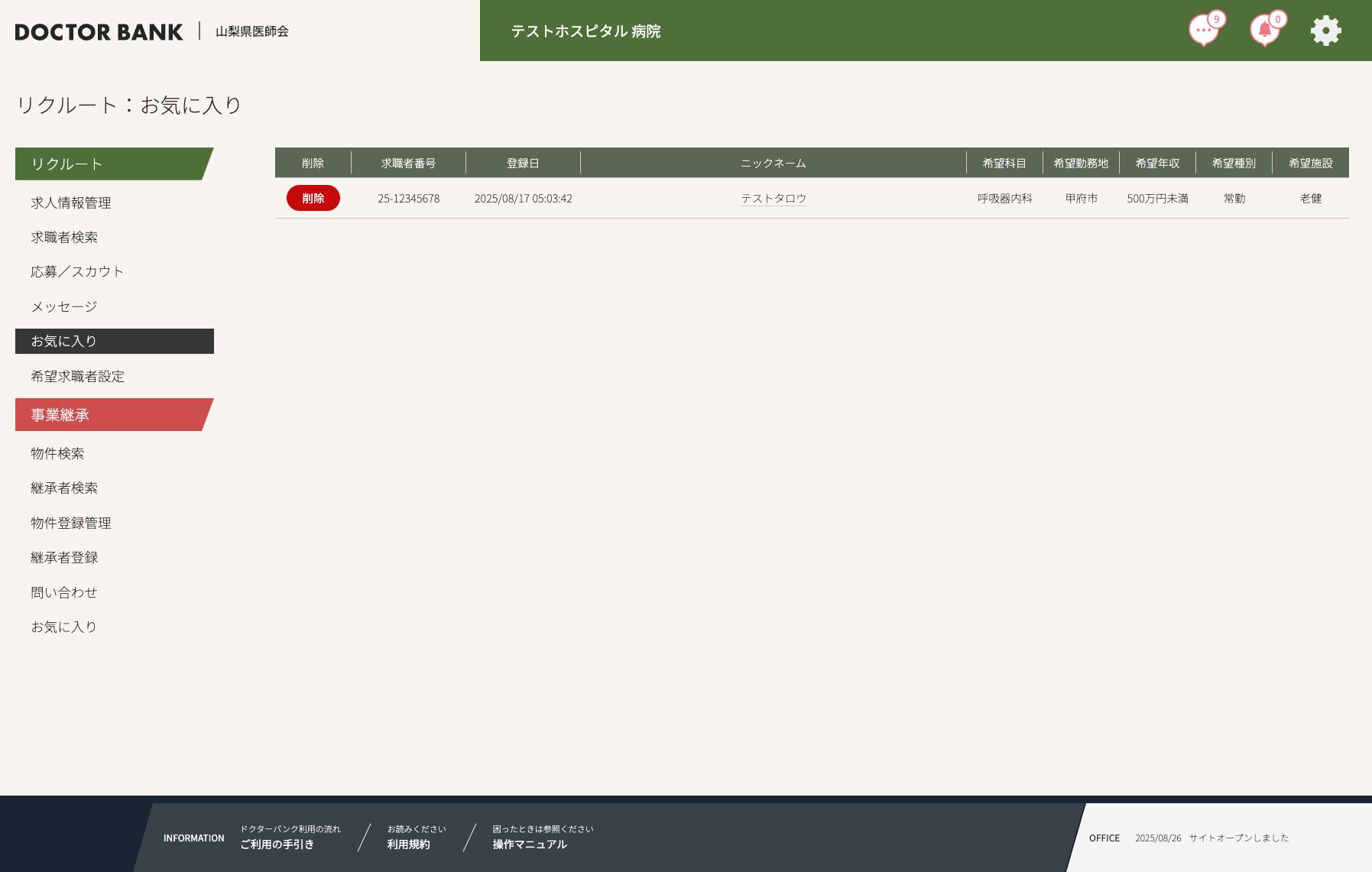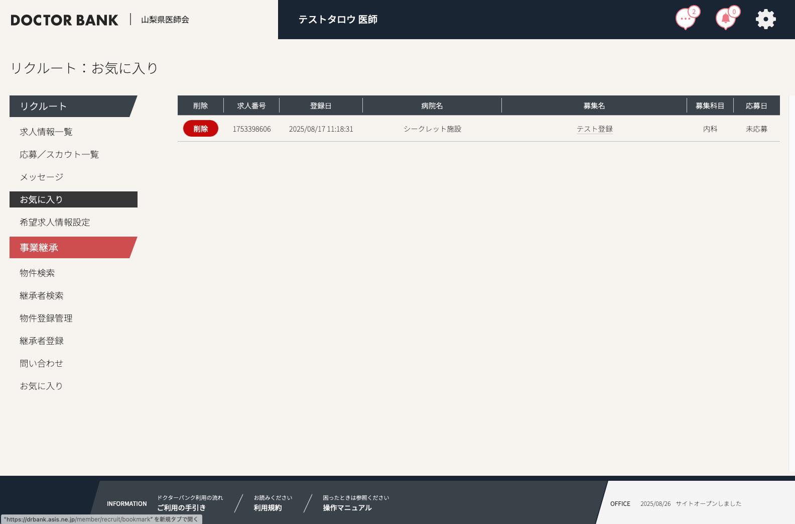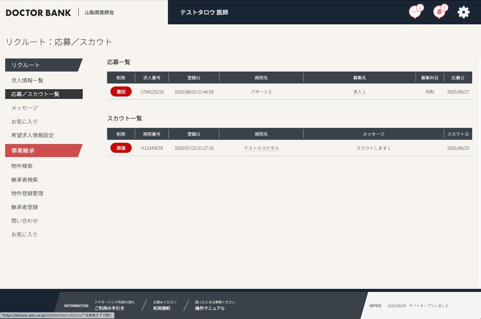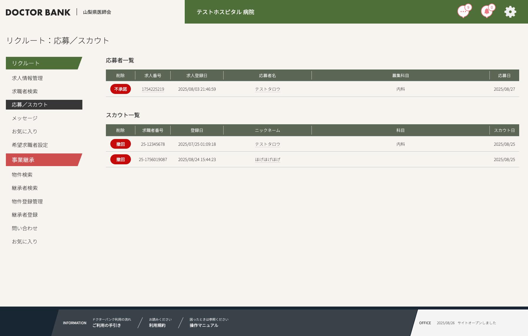応募:応募は医師から貴病院の求人情報に対して来なわれたリストです。応募者名をクリックすることで求人情報を閲覧することができます。